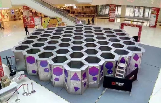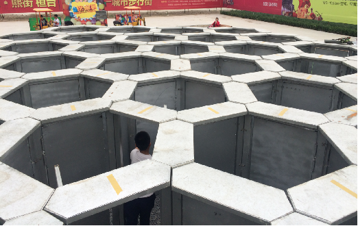 蜂巢,自然界中最完善的構造迷宮,人們耳熟聞詳的一種智力游戲,就是將蜂巢和迷宮這兩種毫不相干的東西巧妙結合在一起。整個迷宮呈一個規則的六邊形,如果從高處俯瞰就是一個放大的蜂巢。內部共有37個六邊形空間、132個扇門,多條選擇線路。可謂史上最變態的大型迷宮道具,足以挑戰你的億萬腦細胞!